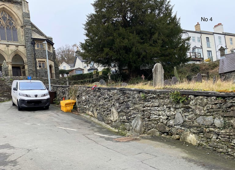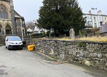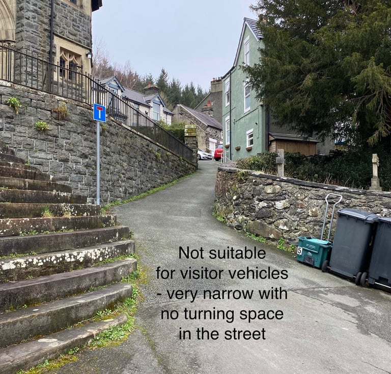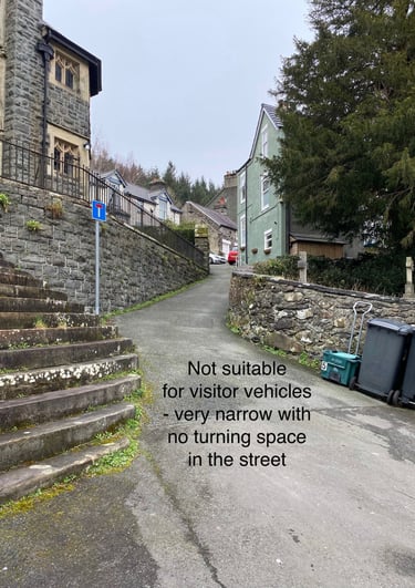 Because there is no turning space in the street and the road in between the 2 churches is so narrow we would strongly recommend that you do not attempt to drive up the hill into the street. In practice it is challenging for longer cars and those with low skirts or trims to reverse down in between the walls.